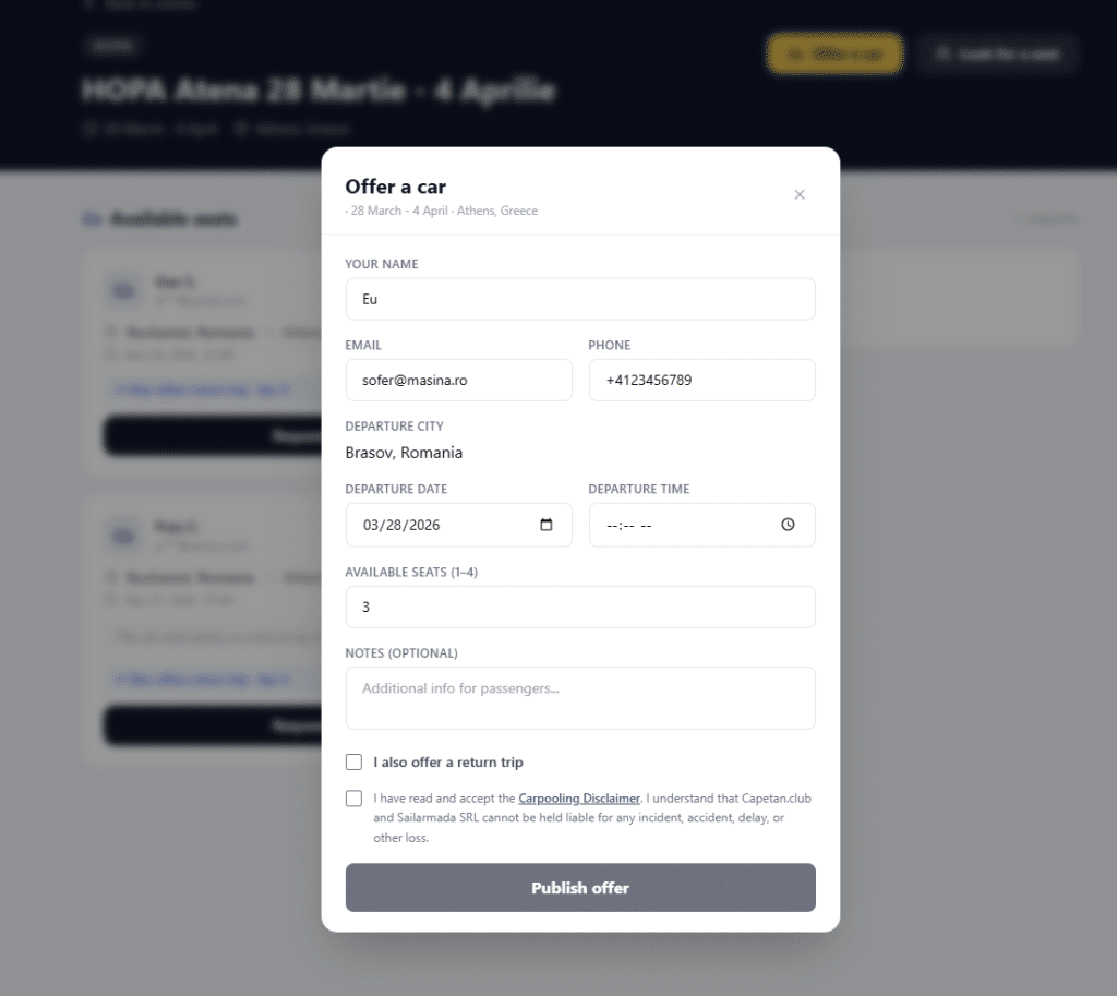Sagen wir, in zwei Wochen haben Sie einen Kurs HOP in Kavala und verlassen Bukarest mit dem Auto. Eingabe auf Mitfahrgelegenheit.capetan.club, Sie stellen einfach eine Reise mit Ihren Angaben ein - wo Sie abfahren, wann, wie viele Plätze Sie haben - und das war's. Andere Mitglieder mit der gleichen Route können Sie direkt kontaktieren.